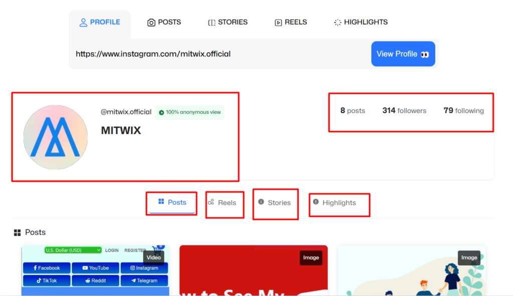 You’ll see a feed of photos, videos, and reels if the account is public. Scroll through like a normal profile, but no likes or comments are possible. Some tools even show highlights from old stories.
